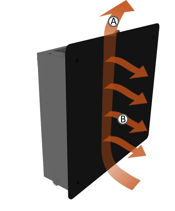 El aire ingresa por debajo del calefactor, se calienta al entrar en contacto con la cámara y es expulsado a temperatura por la parte superior.